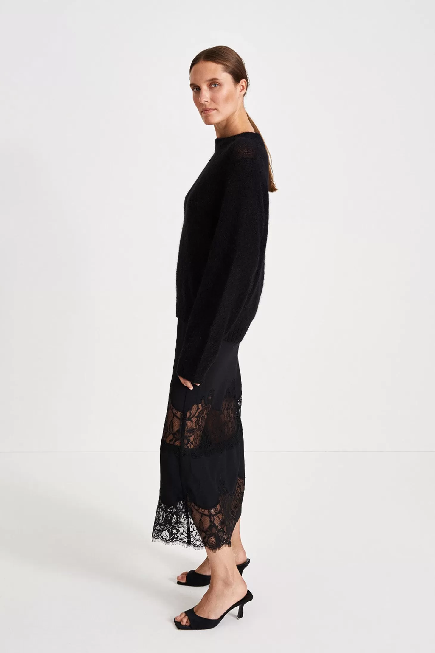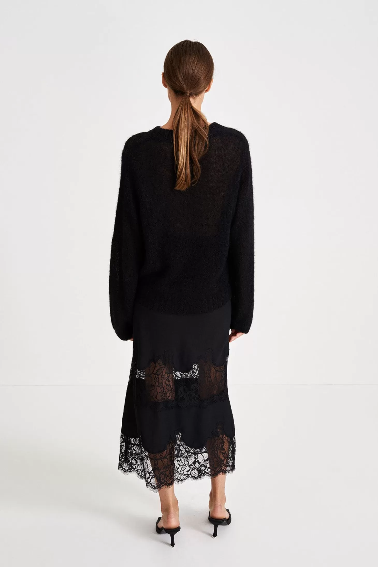 The Ankle-Length Magda Skirt Is Made Out Of Lustrous Fabric Adorned With Two Rows Of Delicate Lace Trim. Meticulously Crafted With A Commitment To Both Elegance And An Impeccable Fit, This Mid-Length Skirt Discreetly Incorporates An Elastic Waistband, Seamlessly Hidden From The Outside.