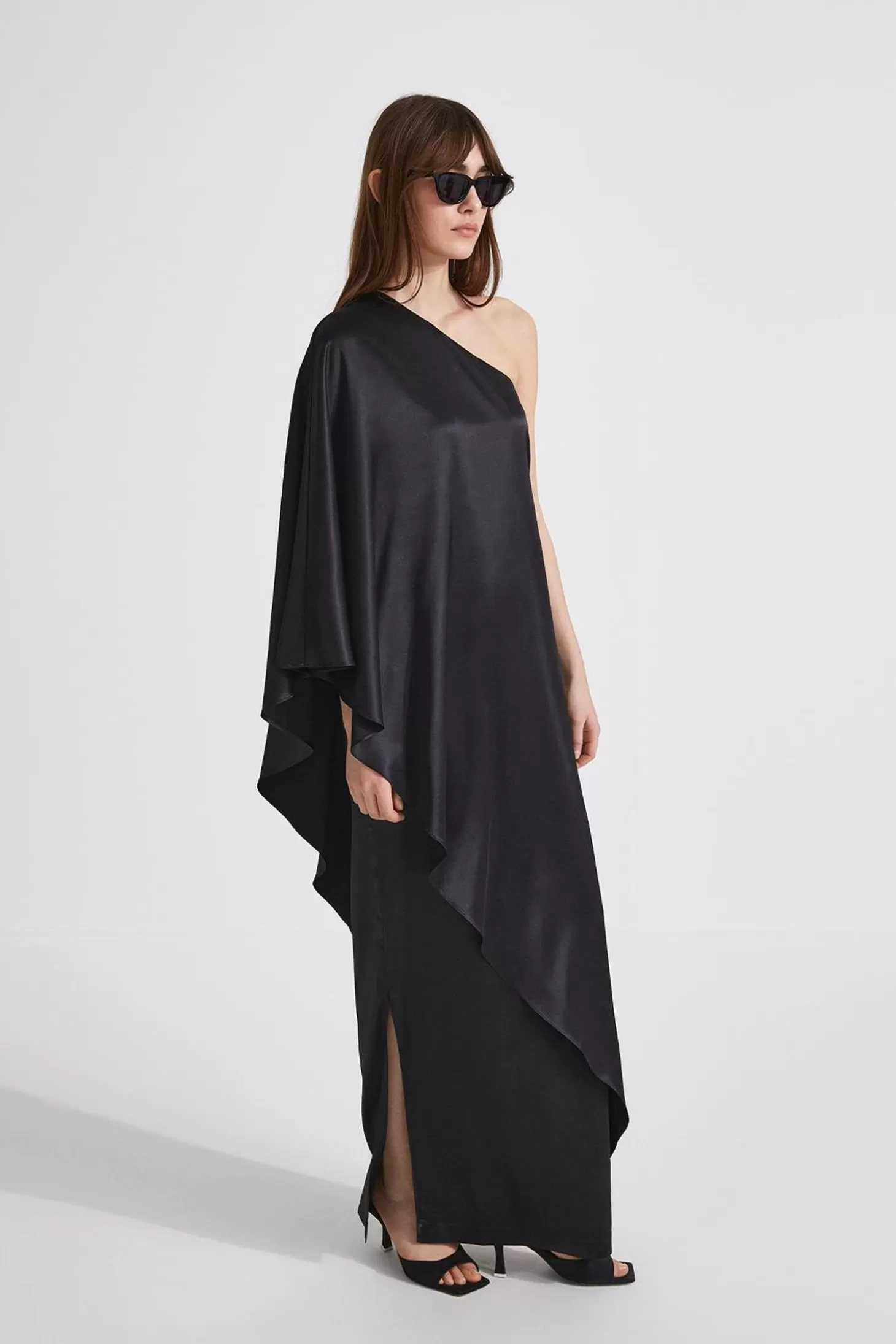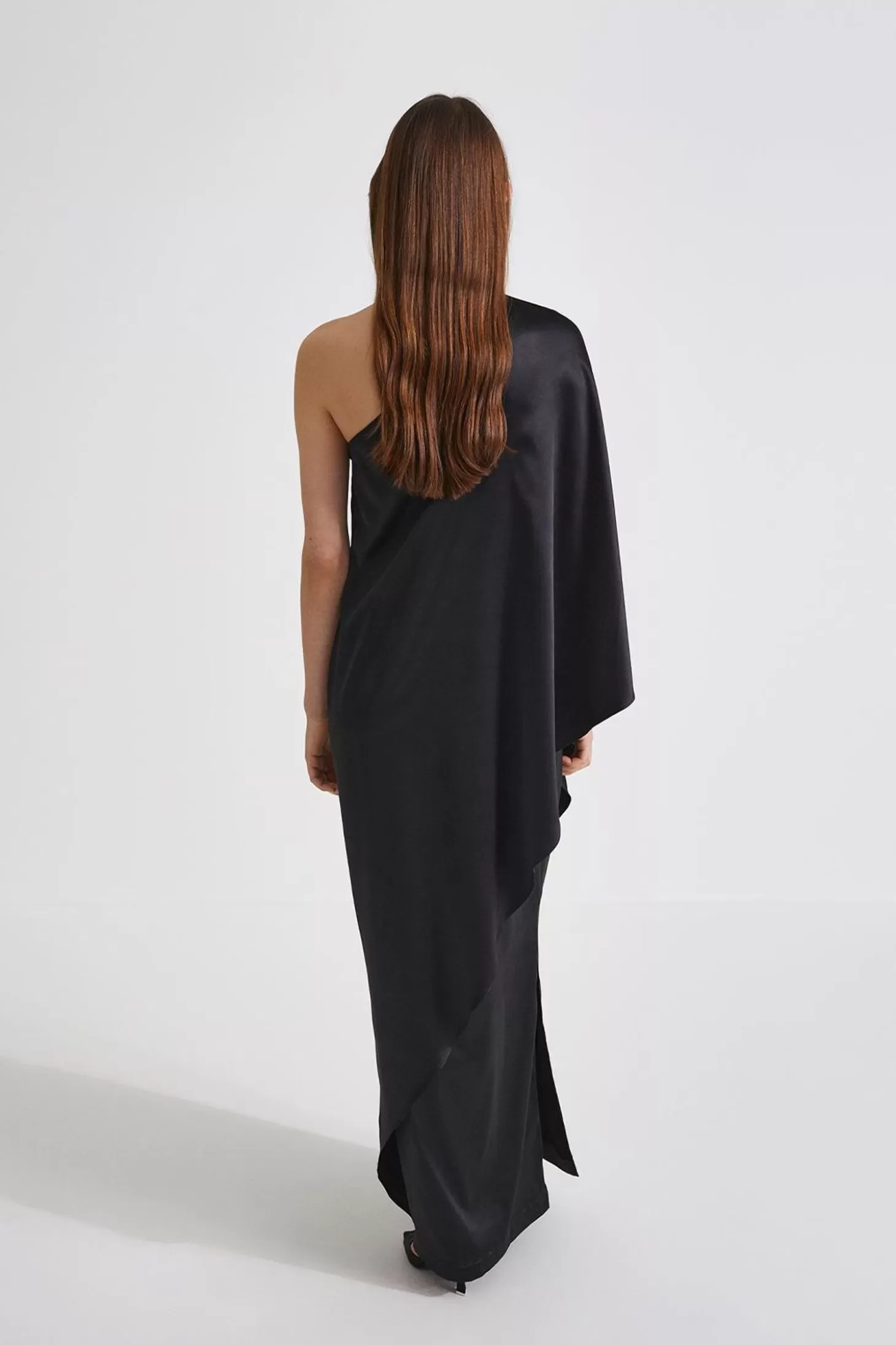 Magdalena Is A Straight Fitted One Shoulder Dress In Full Length Featuring A Draping Detail And Slit Along The Right Side. It Is Fully Lined With A Hidden Zipper In Side Seam For Easy Closure And Was Crafted From A Flattering Shiny Fabric That Will Fall Elegantly On Your Body.
