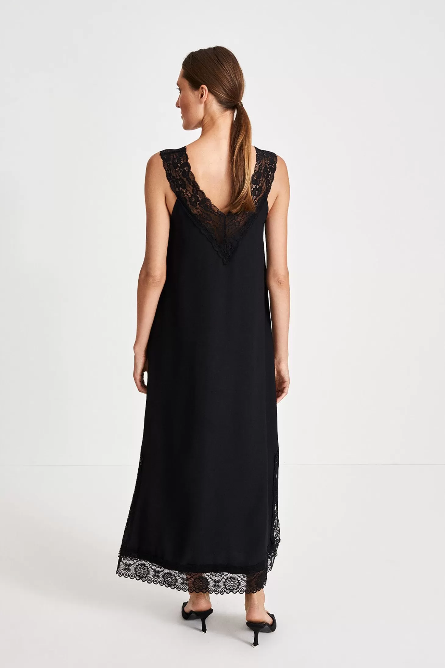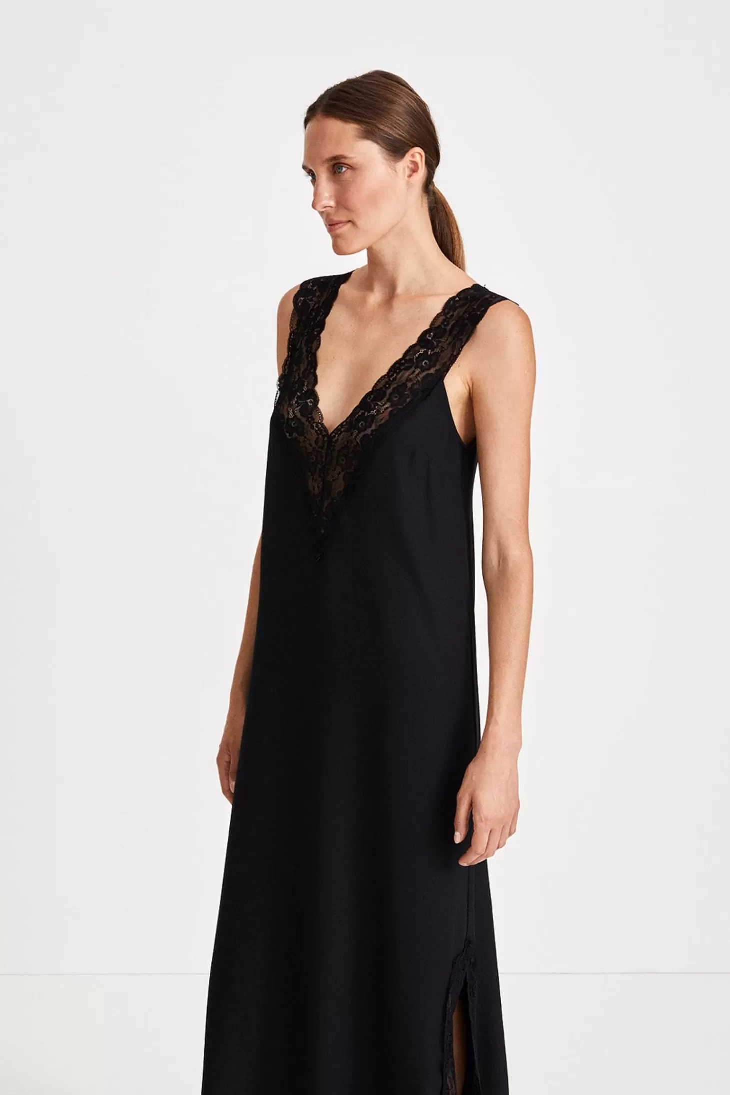 The Maleo Slip Dress Is Crafted From Chiffon Fabric Adorned With Delicate Lace Details. The Dress Features A Deep V-Neckline At Both The Front And Back, With Lace Accents Running Alongside As Well As On The Side Slits And The Trimmed Bottom Hem. The Design, Coupled With Its Loose Fit And Ankle-Length, Makes It The Perfect Dress For Any Special Occasion.